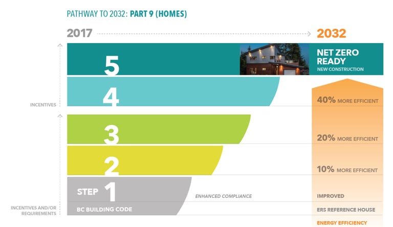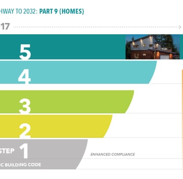 The BC Energy Step Code establishes a series of measurable energy-efficiency requirements that builders must meet in communities that reference it in their building and development bylaws. The regulation groups these performance targets into a series of "steps" of increasing energy efficiency. Step 1 simply requires confirmation that new buildings meet the existing energy-efficiency requirements of the existing BC Building Code. Meanwhile, at the opposite end of the scale, Step 5 for homes represents a home that is net-zero energy ready. A Step 5 home is effectively the most energy-efficient home that can be built today.